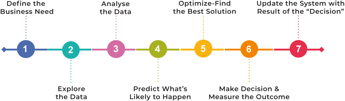 To solve the business problems using the relevant data and turning it into insights, providing the enterprise with the knowledge it needs to proactively make decisions we follow a 7-step business analytics process.